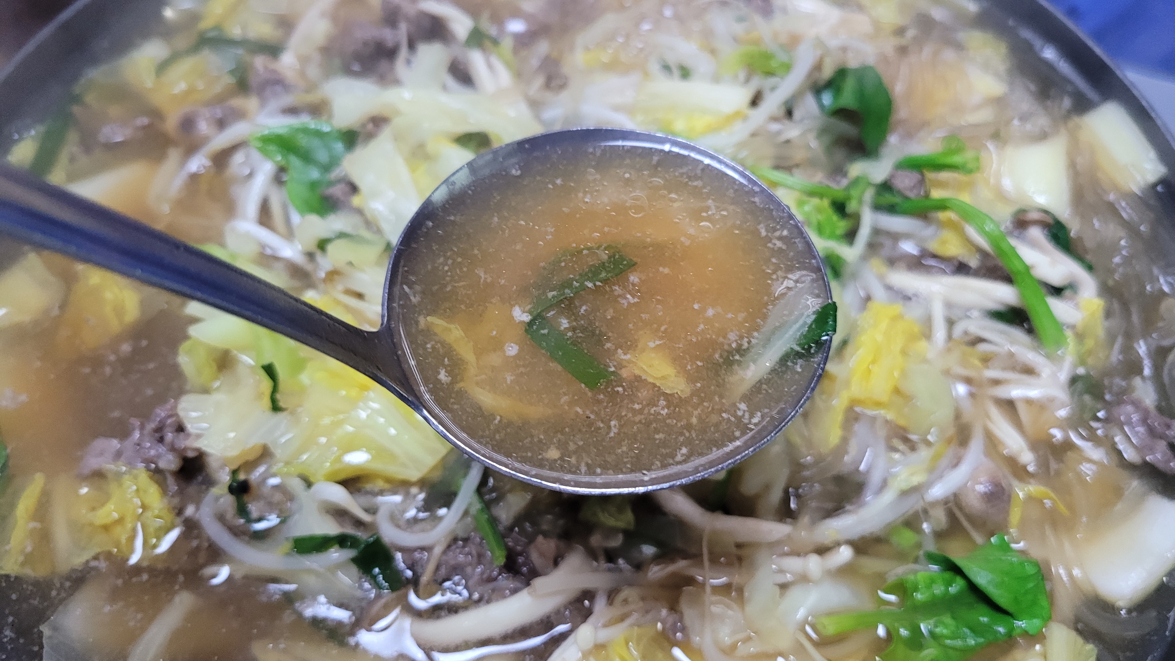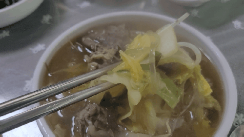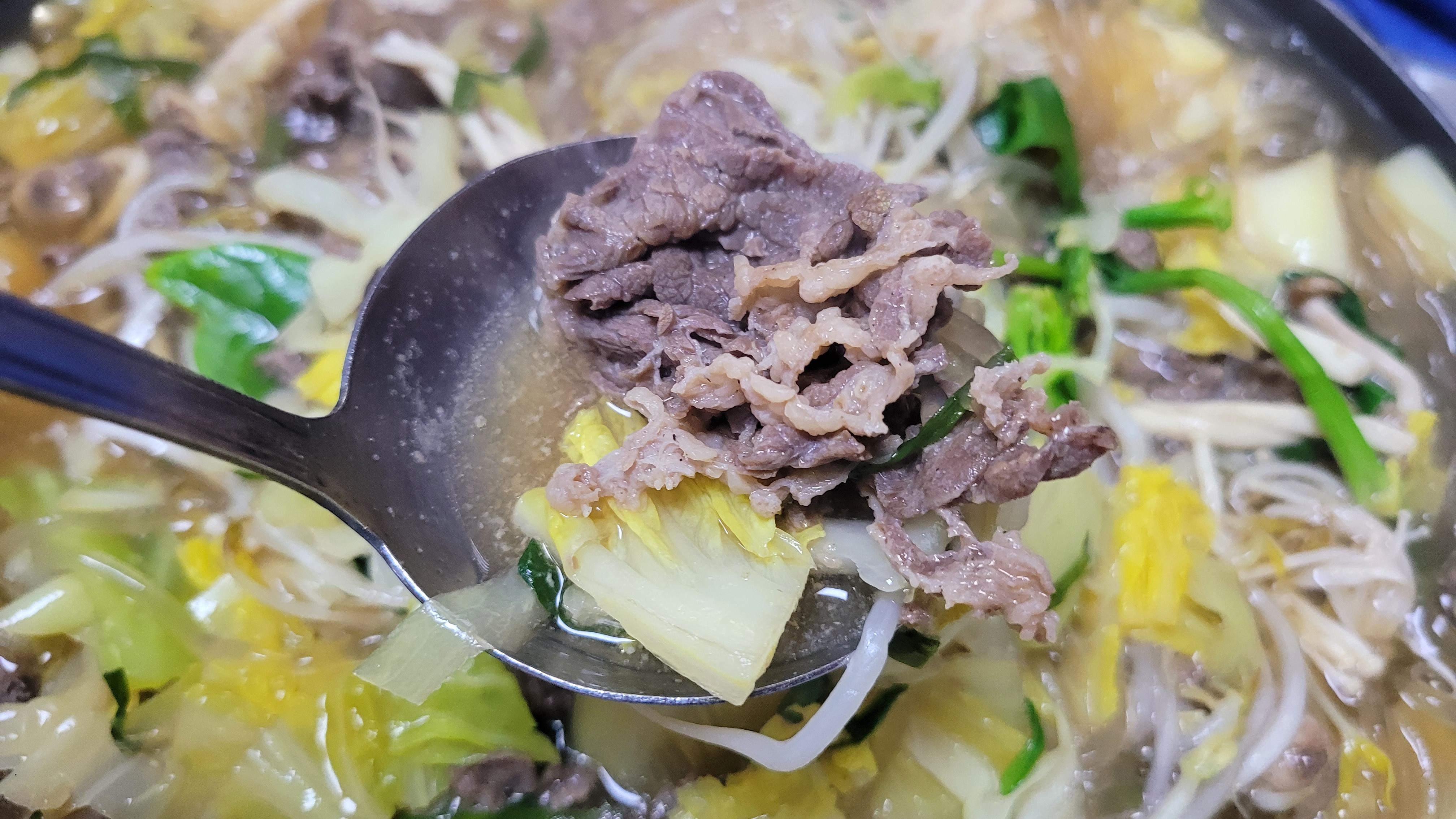 국물을 잔뜩 먹은 당면은 최고죠. 당면도 넉넉하게 들어가 있어서 밥 한 공기가 다 먹기가 쉽지 않답니다. 기본적으로 국물이 시원한 이유는 배추가 많이 들어가 있다는 점이고 여기에 시금치 조금을 올려서 색상의 조화를 추구하였네요.