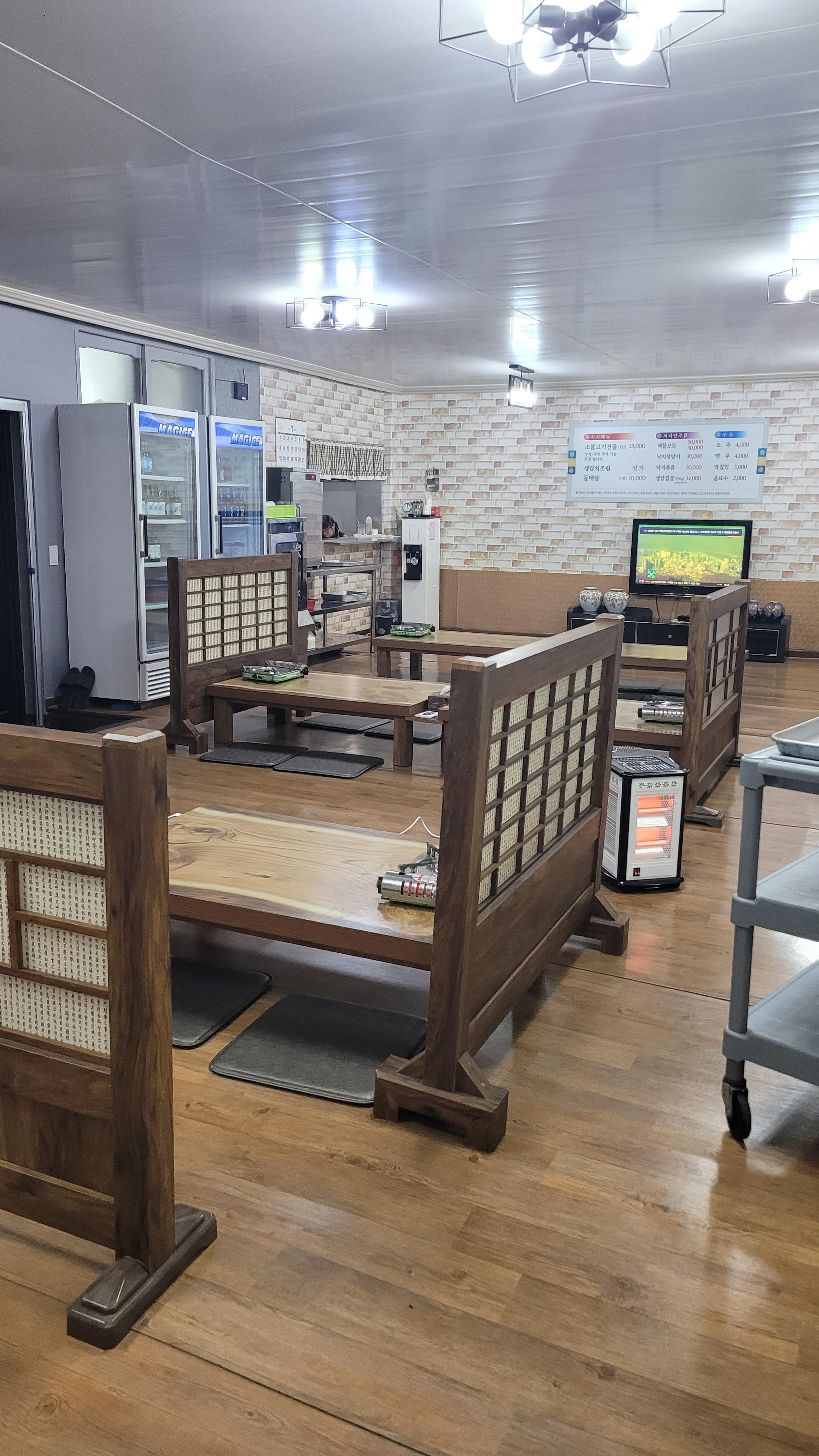 식당 안은 신발을 벗고 들어가서 식사를 하는 것으로 되어 있고요. 미리 예약을 하시면 방에 테일에서 식사를 할 수 있답니다. 평일에는 예약을 하셔야 식사시간에 편하게 드실 수 있으니 참고하시고요. 사장님이 워낙 친절하셔서 미리 세팅도 다 해주십니다. 깔끔하고 청결한 식당 안의 모습이고요.