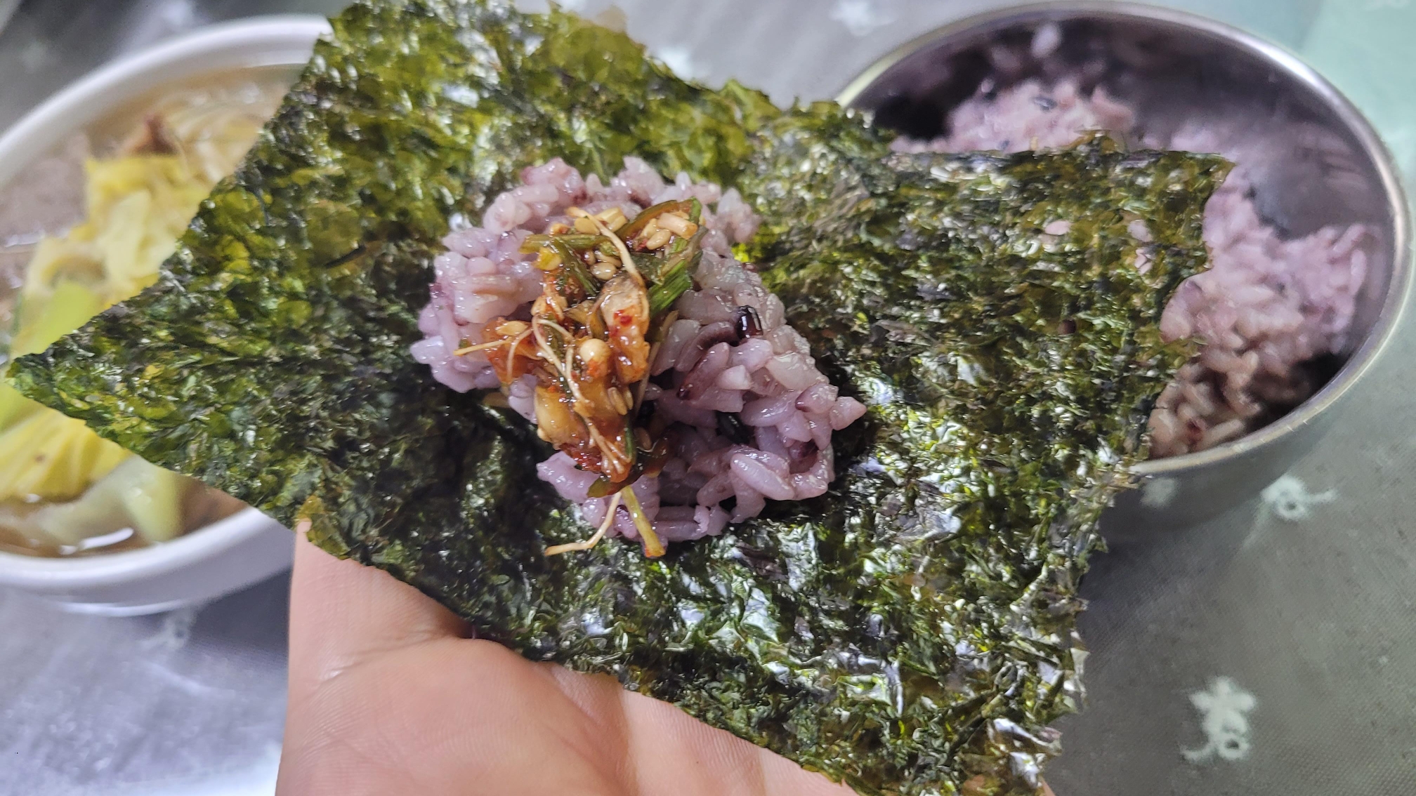 김도 구워서 주십니다. 야채를 송송 다져서 간장에 넣으니 이걸 김, 밥을 함께 싸서 찍어먹으면 천국이나 다름없습니다. 밥도 검은 쌀을 사용하네요.
